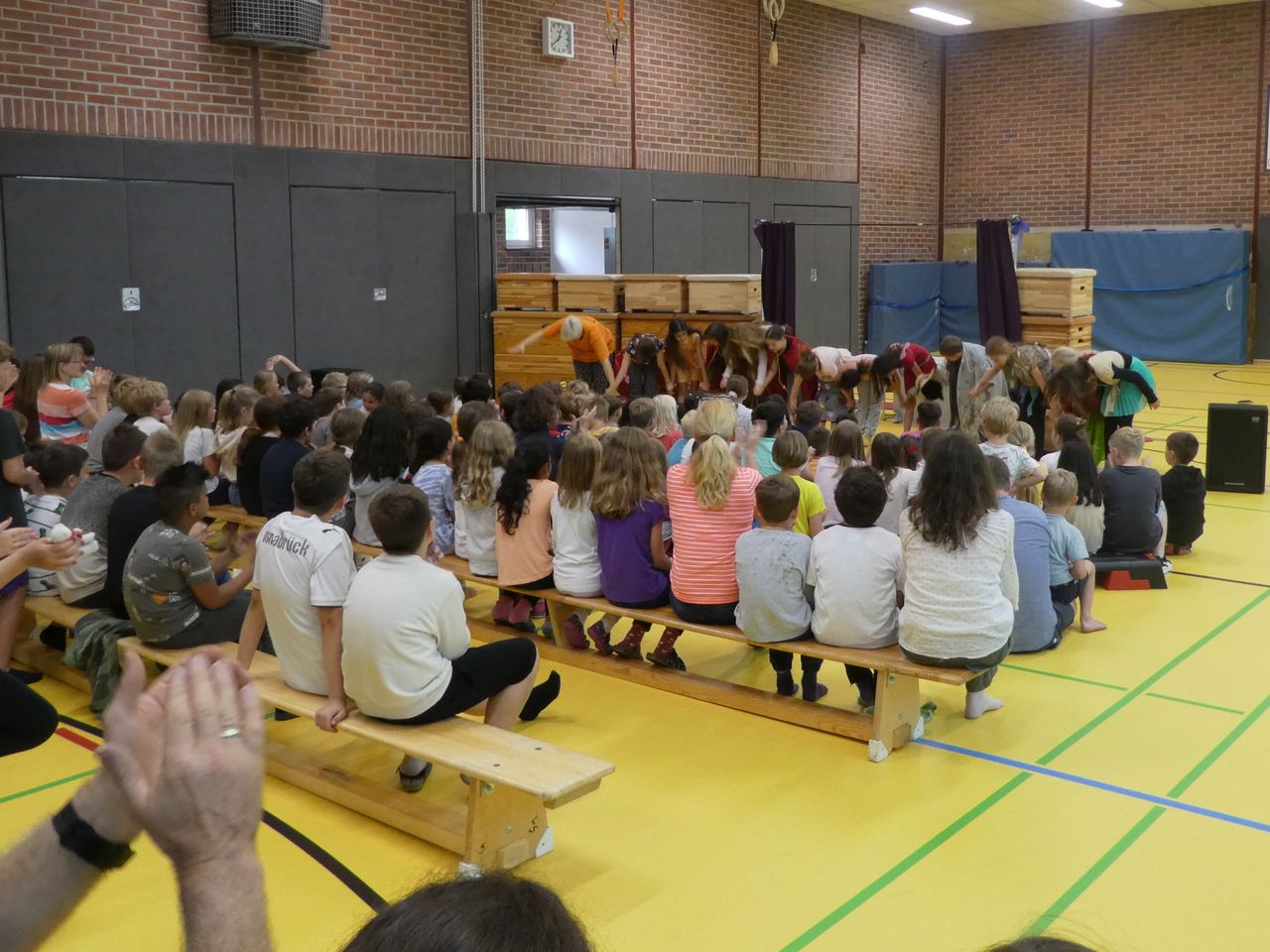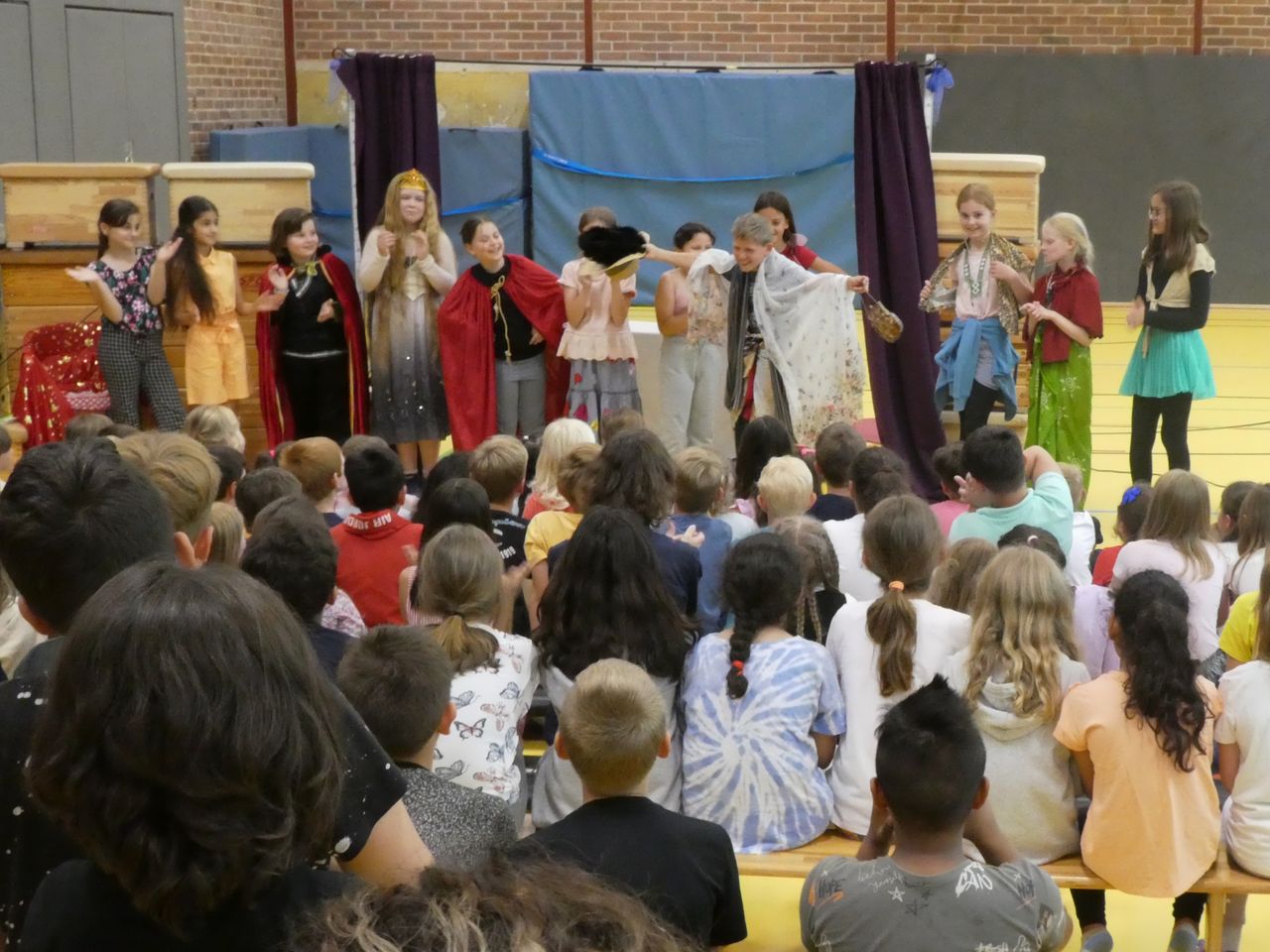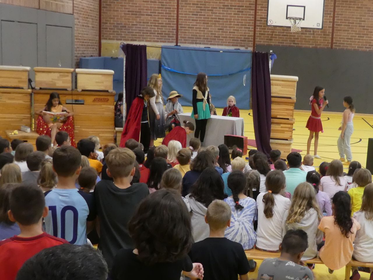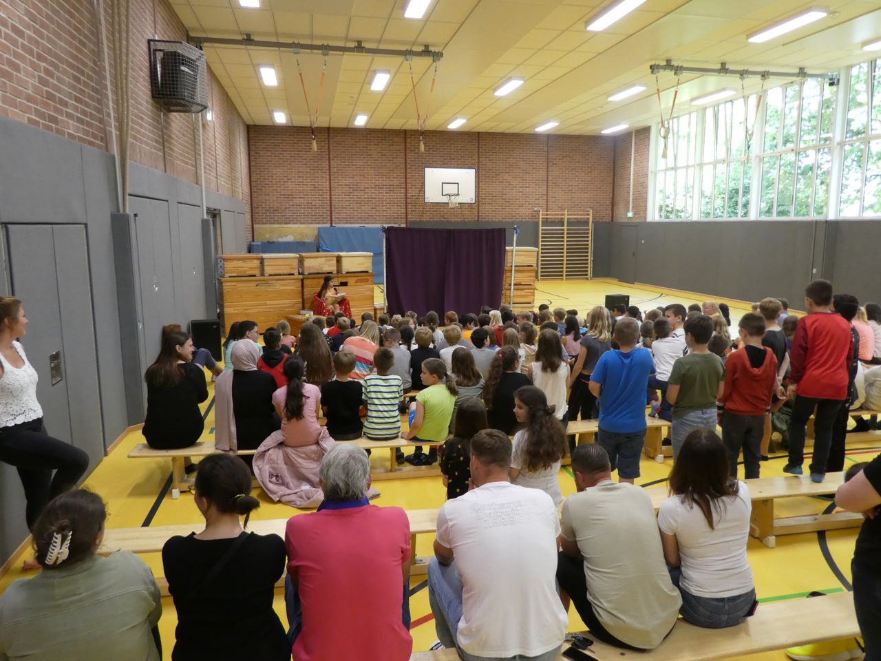 Und dann war, wie erwähnt, der Tag der Aufführung da! Ab der dritten Stunde wurde die Turnhalle zum Theater. Mit Bühne, Vorhang, Sitzreihen, Anlage mit Microphon, Backstagebereich… und auch das Lampenfieber wurden bei den Kindern immer größer. Als die Generalprobe endlich geschafft war, hieß es BÜHNE FREI!