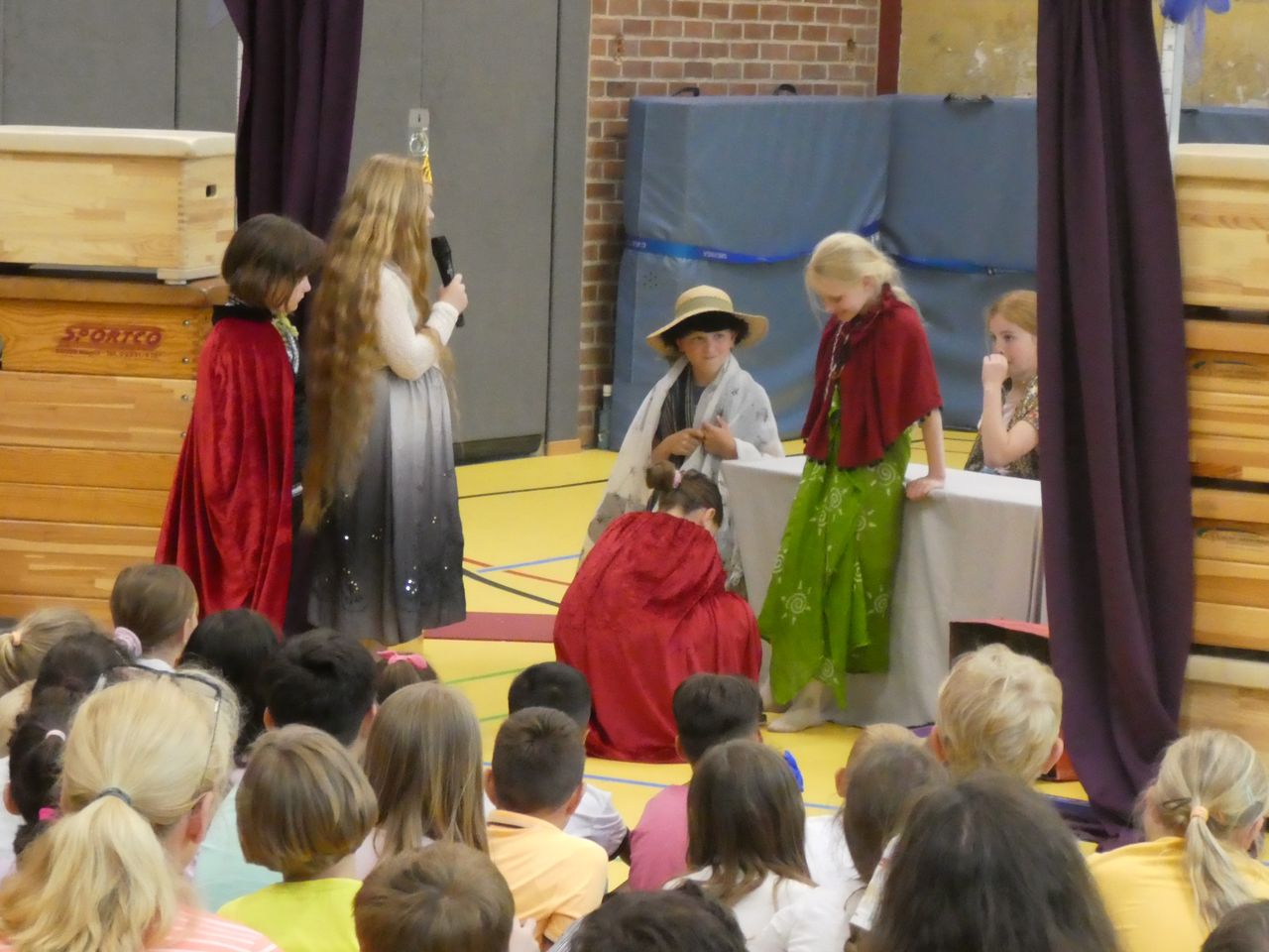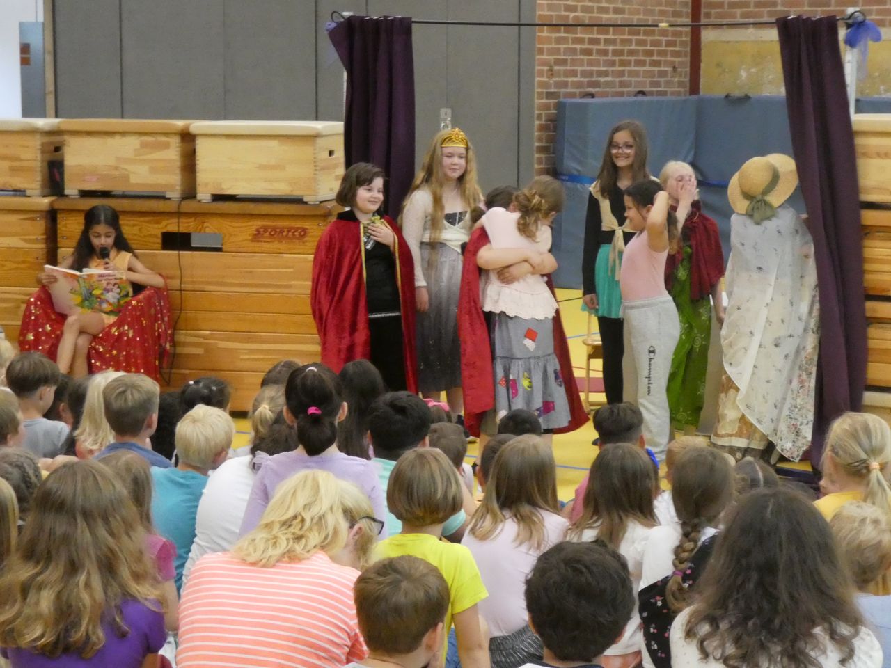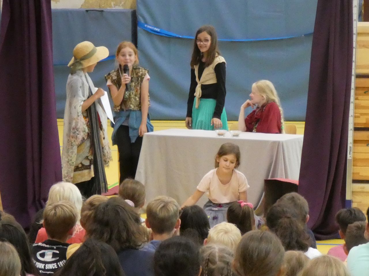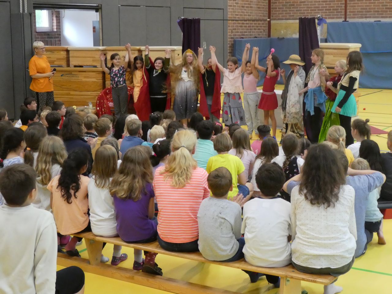 Und dann war, wie erwähnt, der Tag der Aufführung da! Ab der dritten Stunde wurde die Turnhalle zum Theater. Mit Bühne, Vorhang, Sitzreihen, Anlage mit Microphon, Backstagebereich… und auch das Lampenfieber wurden bei den Kindern immer größer. Als die Generalprobe endlich geschafft war, hieß es BÜHNE FREI!